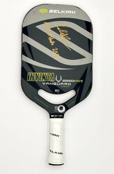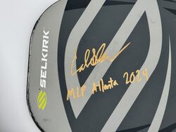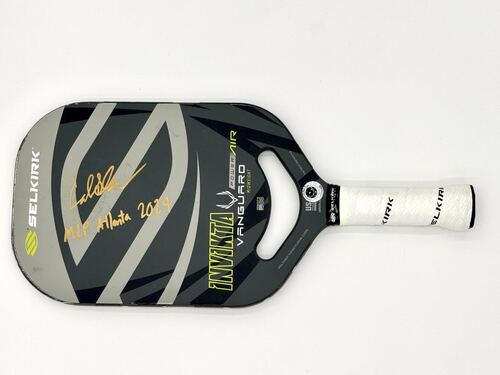 Collin Shick played with this paddle in the MLP tournament in Atlanta, GA, May 9-12, 2024. The paddle is a Selkirk Invikta Vanguard Power Air Midweight paddle with custom weight configuration for Collin Shick. Signed in GOLD